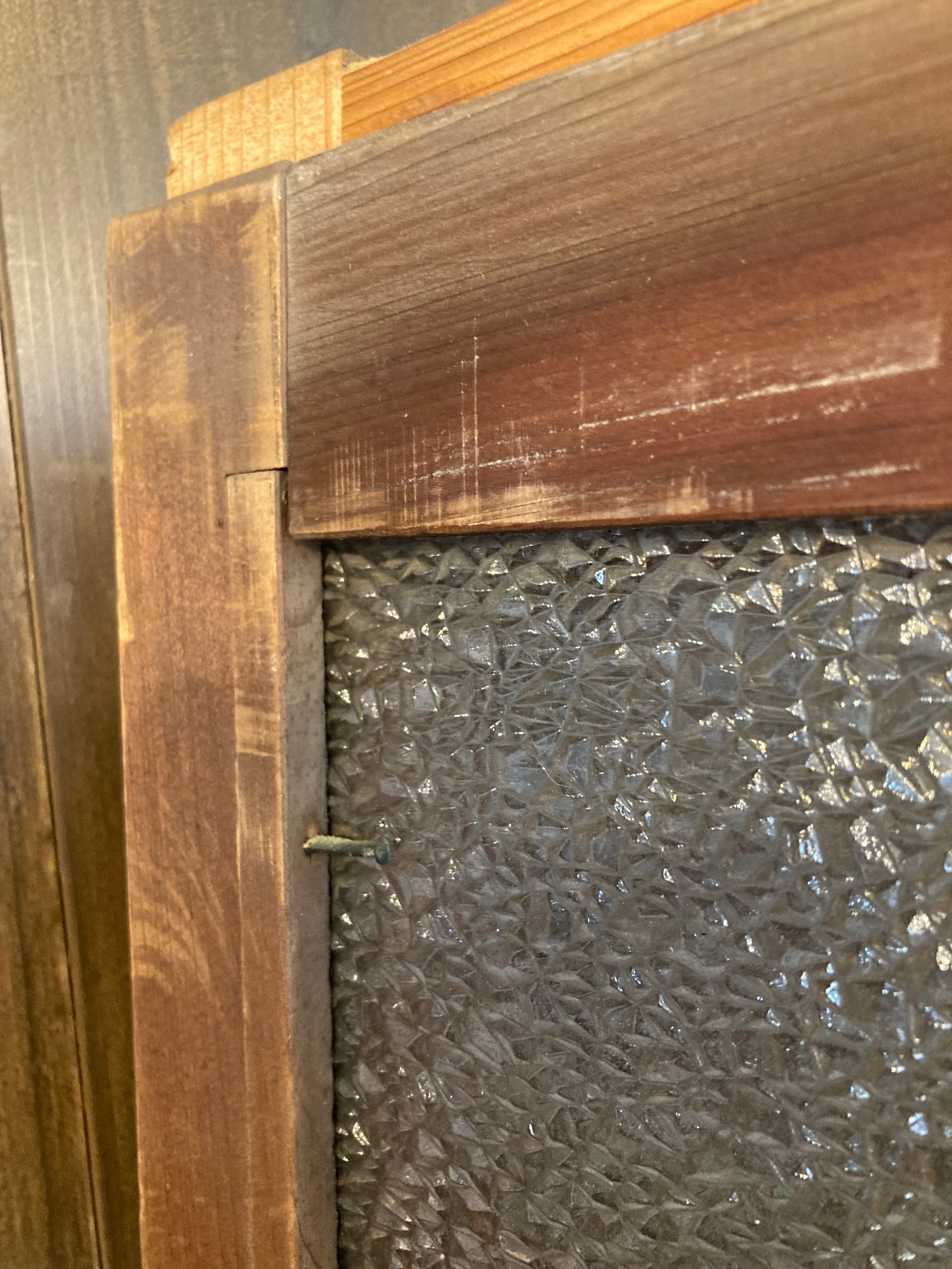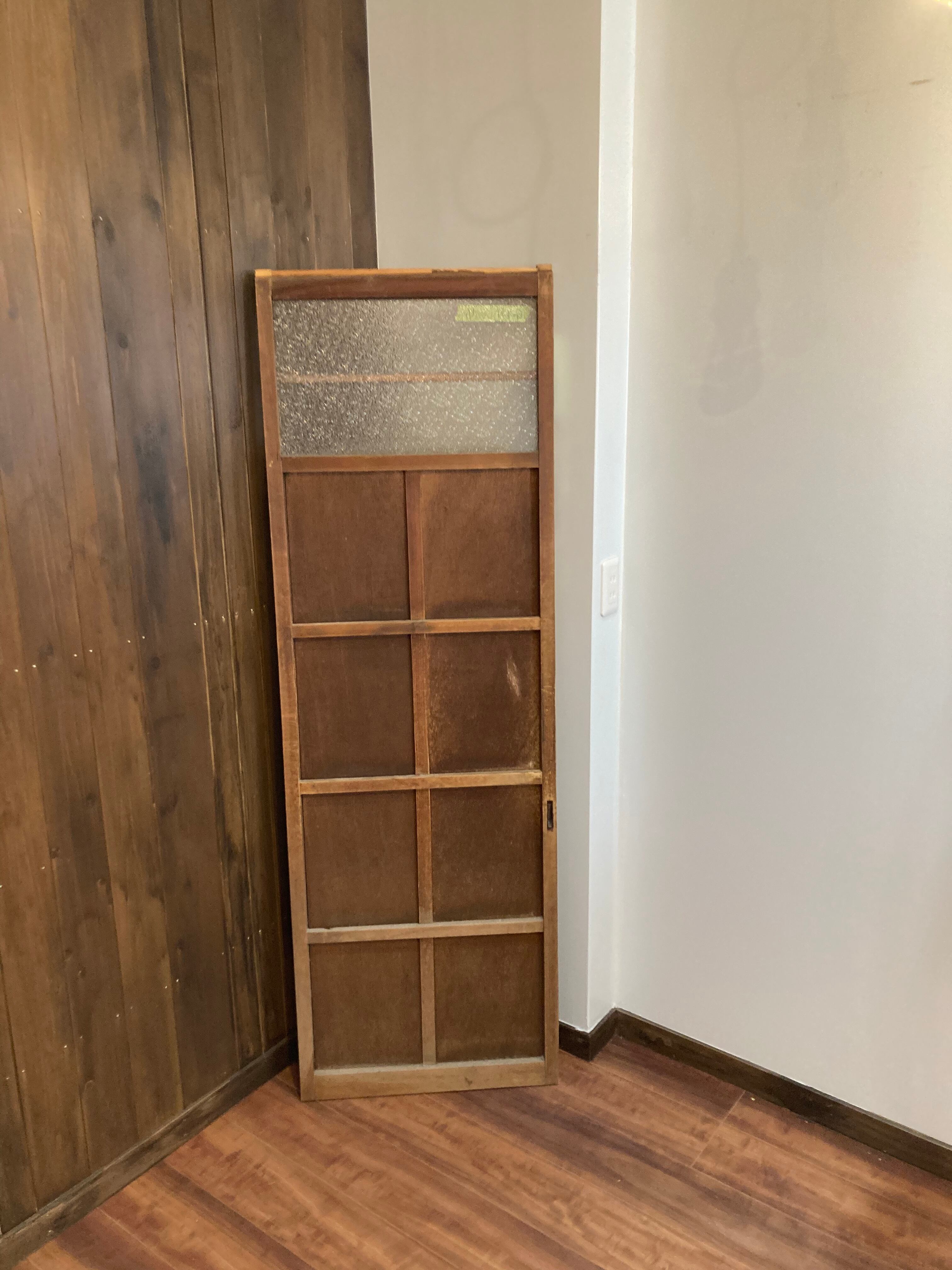 注意事項 : ベニヤの下の方がボロボロで張り替えが必要です。取手が破損しています。その他木枠の部分は傷、汚れ、スレ、ほこりがございます。(写真に写っていない、傷やスレや汚れ等ある場合がございます)ガラス部分は比較的綺麗な状態です。一度ガラスを外してガラスクリーナーで拭き掃除をし、木枠は水拭き掃除をしてあります。一部取りきれない汚れが残っている場合がございます。