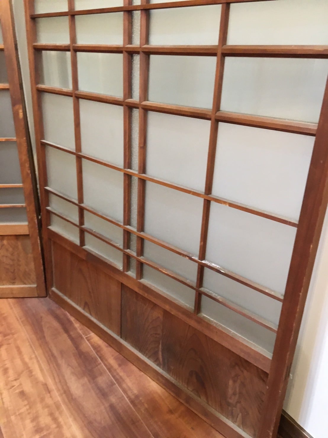 注意事項 : 割れているガラスがあります。腰板にすきまがあります。高さ方向を切り詰めてあります。木枠の部分は水シミ、傷、汚れ、スレ、ほこりがございます。(写真に写っていない、傷やスレや汚れ等ある場合がございます)ガラス部分は比較的綺麗な状態です。一度ガラスを外してガラスクリーナーで拭き掃除をし、木枠は水拭き掃除をしてあります。一部取りきれない汚れが残っている場合がございます。
